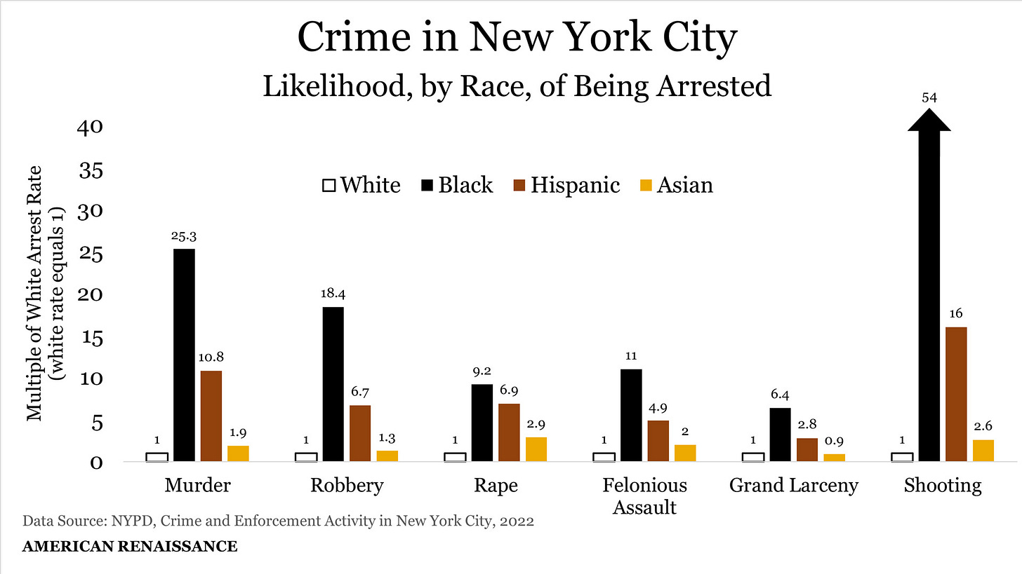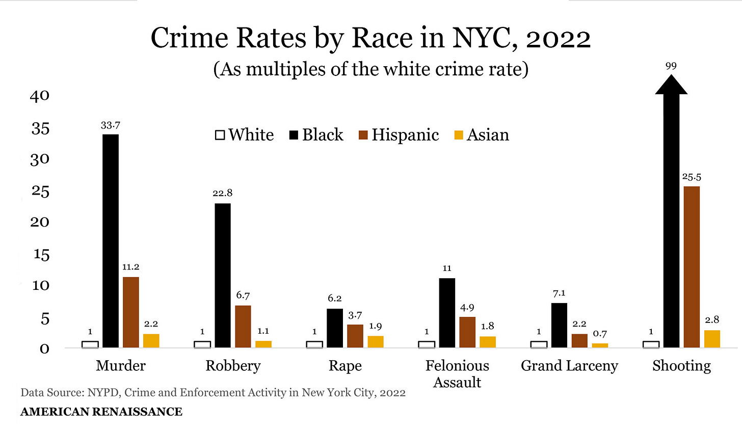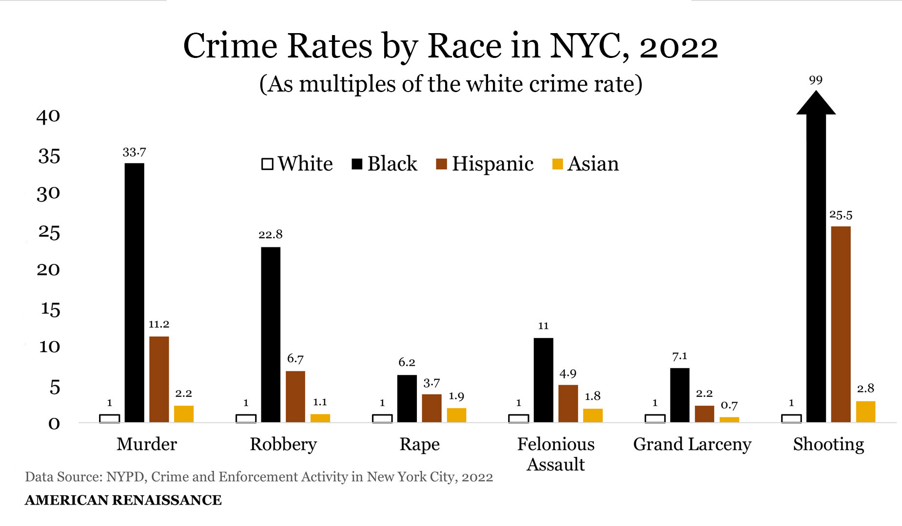 The typical CNN/MSNBC/NAACP argument to this is that blacks live in poverty, go to bad schools and we just need more income redistribution to help them. Well, that’s exactly what we have been doing for generations. When exactly will spending more money actually yield results? The answer of course is never. This isn’t about poverty or patriarchy or structural racism or any of that neoliberal garbage. This is about people, genetics and evolution. These statistics will never meaningfully change no matter what amount of money is spent to try to change them. There are two ways to fix this. 1) keep violent criminals away from civilized society, ie build more prisons and have a zero tolerance policy or 2) return NYC and the rest of the country to a 1920’s demographic profile. This would involve revoking citizenship, mass deportation and foolproof border security. I’m not advocating for either one, those are just the two options I see. More income redistribution will not help. The government media complex telling the public that white people are bad will not help. By the way, the FBI crime stats are basically the same as these. The government knows this. The media knows this. Why are they saying the opposite? Who could be behind this plan? The violent crime and disruption of society is a feature, not a bug. There is a group who is behind this, this isn’t happening by accident.