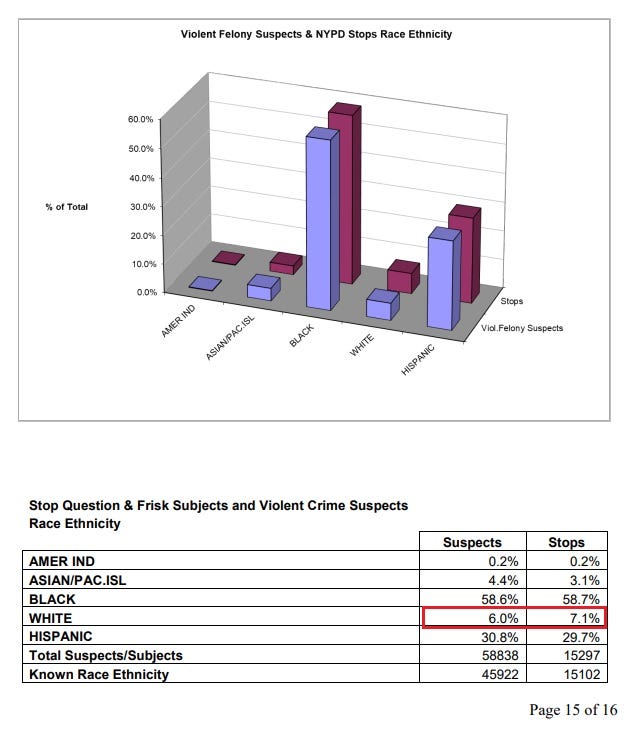 It’s very interesting that the media and activists insist that non-whites are subject to questioning by the police more often then they should be. According to NYC’s data, the opposite is true. Whites are more likely to be stopped and questioned than they are suspected of violent crimes. Non-whites are less likely to be questioned.