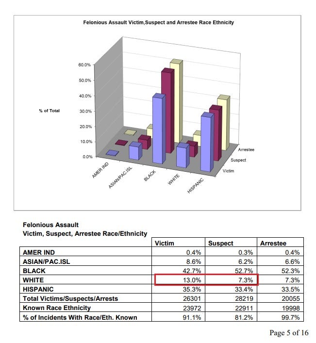 Whites are more than 3 times as likely to be the victim of a robbery than a suspect. Blacks are more than twice as likely to be arrested for robbery as they are of being a victim. Let’s take a look at felonious assault.