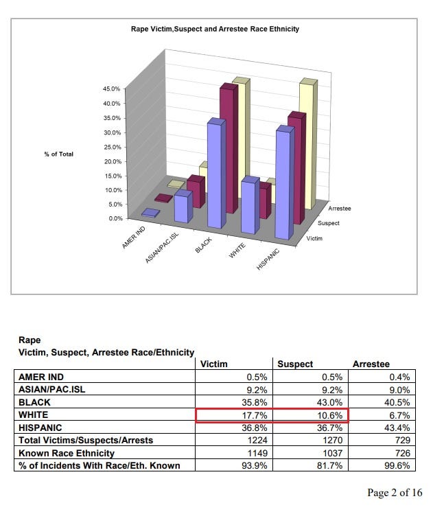 Notice that whites are twice as likely to be the victim of murder than to be the suspect of murder, though the arrests are higher. It’s blacks and hispanics who seem to be doing most of the murdering in NYC. How about rape…