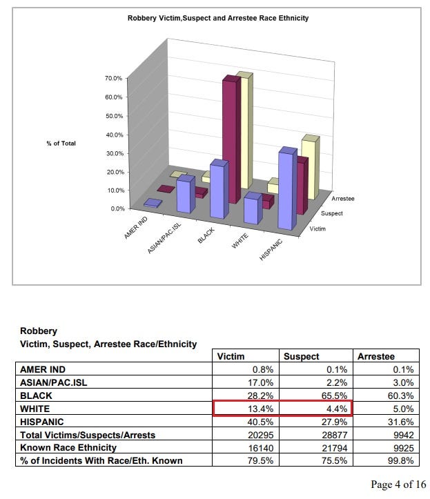 Again, whites are more likely to be the victim of a rape than a suspect. For every white person who is arrested for rape, 2.5 are actually raped. Here, hispanics are the most arrested demo. Robbery?